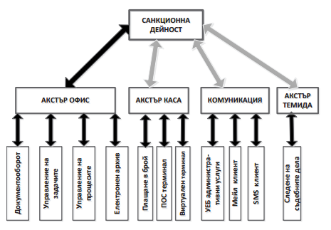 АКСТЪР санкционна дейност притежава сервизно ориентирана архитектура (SOA), която позволява интегрирането є с останалите програмни продукти, показани на фигурата. Основната функционалност, осигурявана от АКСТЪР САНКЦИОННА ДЕЙНОСТ, обхваща: